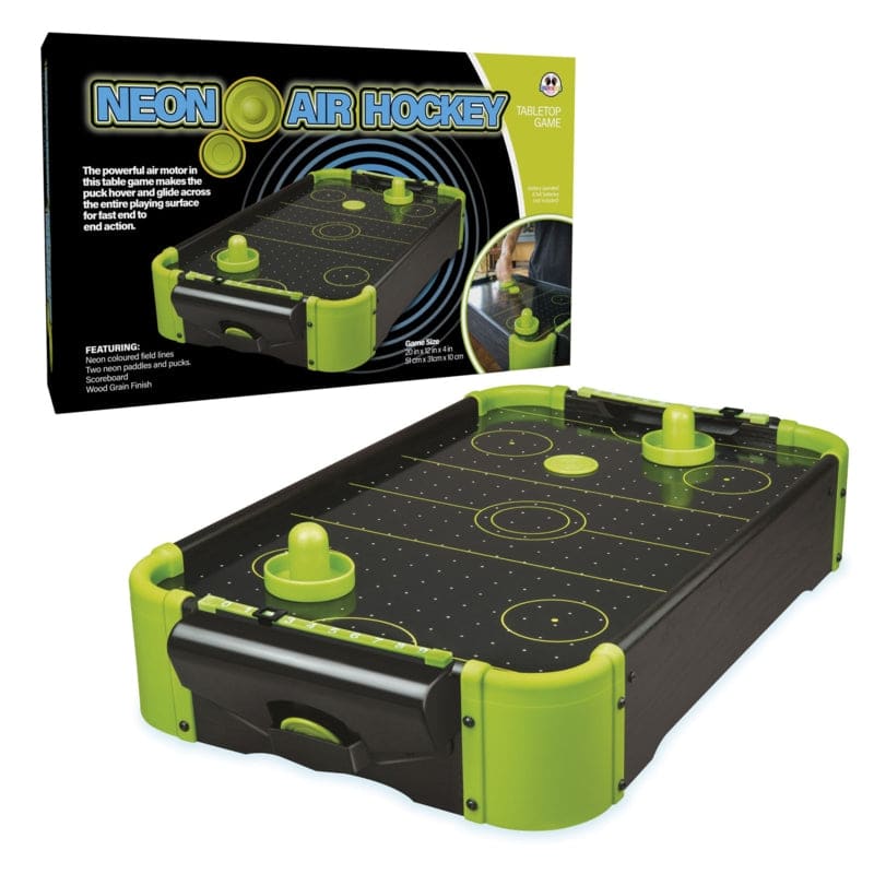 This table features neon coloured field lines, Two neon paddles and pucks. There¡¯s even a scoreboard! The powerful air motor in this table game makes the puck hover and glide across the entire playing surface for fast end to end action. Each packaged in a colour box. It features a wood grain finish and is perfect for any sport¡¯s mad household.